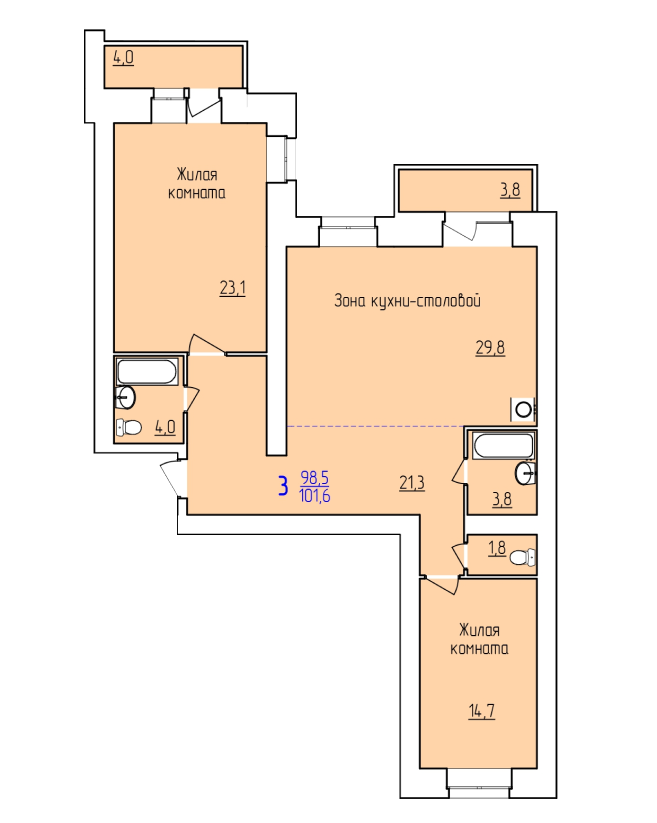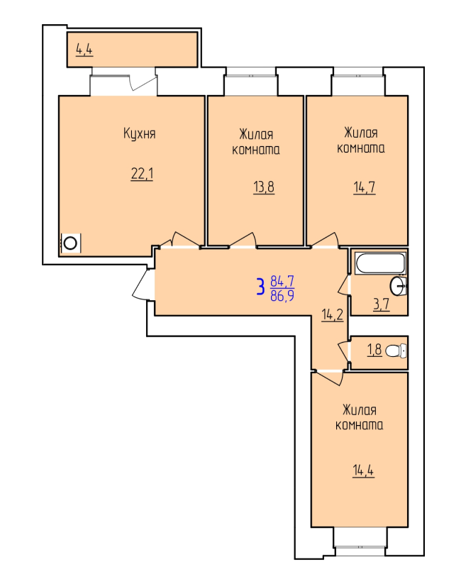 Трехкомнатная квартира с отдельной прихожей, совмещенная кухней-гостиная с выходом на балкон, двумя жилыми комнатами, из одной имеется выход на балкон, одним раздельным и одним совмещенным сан узлами
